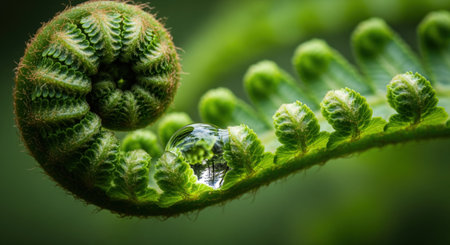 Close up of a vibrant green unfurling fern frond with a clear water droplet nestled in its curve, reflecting the surrounding natural environment. symbolizes growth, freshness, and nature.