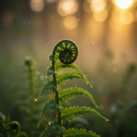 Delicate fern fronds unfurling in lush greenery offer natural beauty with vibrant tones