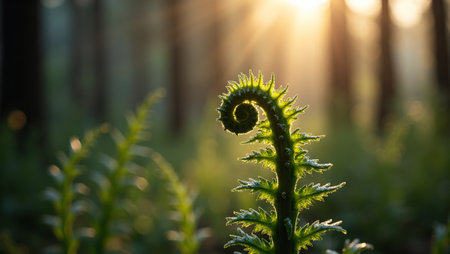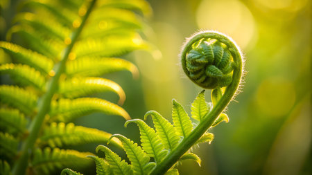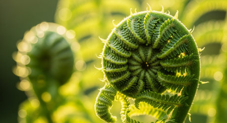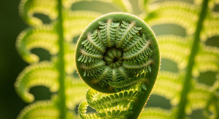 Vibrant green fern fronds unfurling in a natural forest setting, illuminated by soft backlight. delicate fiddleheads show new growth and intricate spiral patterns, symbolizing life and renewal.