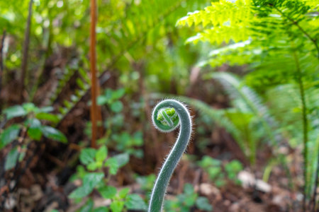 A delicate green fiddlehead fern unfurls amidst lush foliage in springtime.