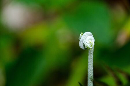 closeup of young curly fern bud with blurred background