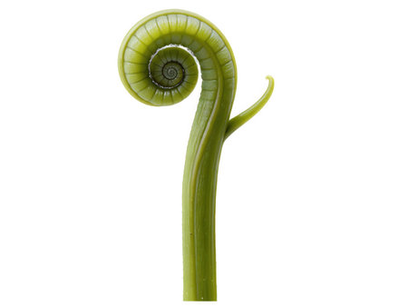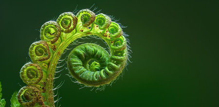Detailed macro shot of a vibrant green fern frond in the process of unfurling in a perfect spiral.