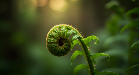 A stunning close-up view of a spiraling green fern frond unfurling gracefully, bathing in soft natural light, exemplifying nature's elegance and tranquility.
