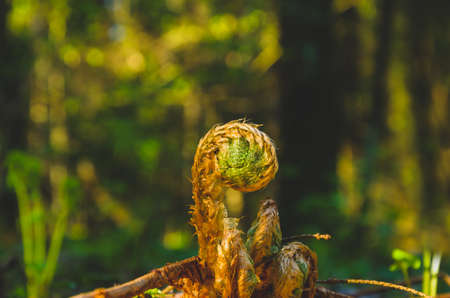 Close up of a young fern bud in a sunny day.