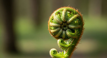 The image features a close-up of a fern frond as it unfurls, showcasing a spiral pattern. The vivid green color and intricate details are highlighted against a blurred background. The style suggests a natural environment with soft lighting. Suitable for illustrations in various projects.
