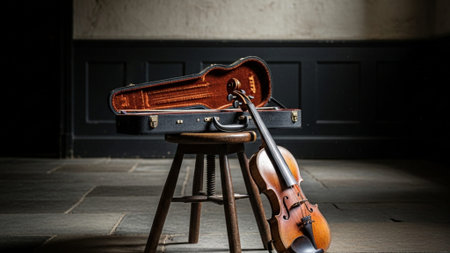 A cinematic environmental wide shot (16:9) capturing a simple wooden fiddle resting against a dark w