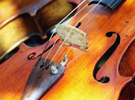 Details with the scroll, peg box, tuning pegs, strings, neck and fingerboard of a violin before a symphonic classical concert