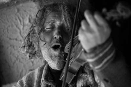 Greyscale black and white portrait of an elderly man singing as he plays a violin totally immersed in the music with his eyes closed in bliss.