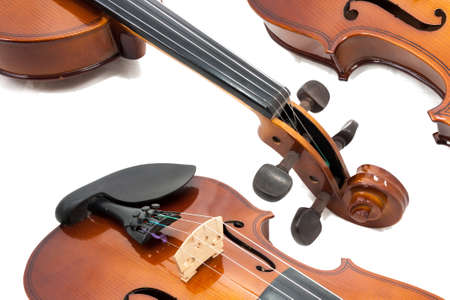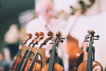 Showcase of antique violins, vintage musical instruments in a row. Production of antique string instruments. Header banner mockup with copy space.