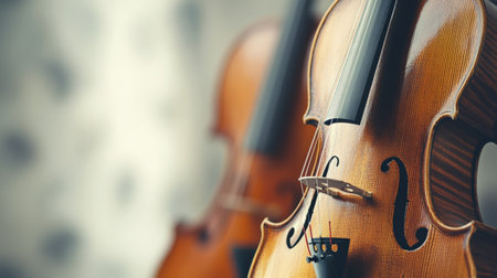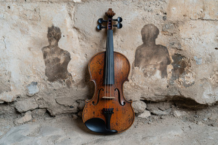 A classic wooden violin lies on a gray textured surface, showing its intricate design and warm tones under soft natural light, creating an inviting and serene atmosphere ideal for music lovers.