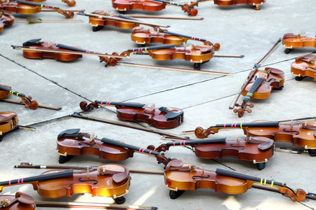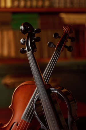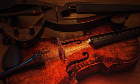 The violin on the dark table, Close - up of violin on the wooden floor, Top view of violin musical on dark wooden floor, Vintage and classic musical instrument used in the orchestra.
