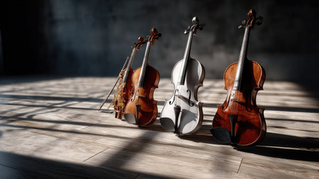 A captivating composition featuring various violins showcased in soft natural light, emphasizing their intricate details against a wooden floor.