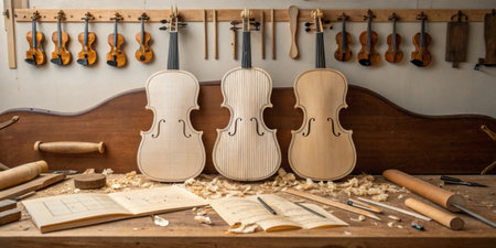 Three unfinished violins rest on a wooden workbench covered in shavings. Crafting tools and sheet music are spread out, indicating a creative process underway in the workshop.