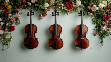 A captivating scene showcasing a trio of violins surrounded by fog and natural elements, blending music and nature in an artistic composition.