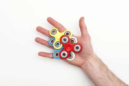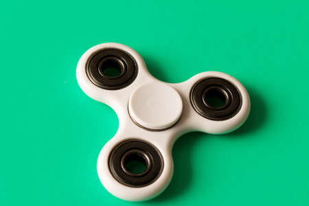 Hand Spiner. Stress relieving toy on white background. Close-up. Top view. Stock photo.