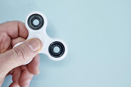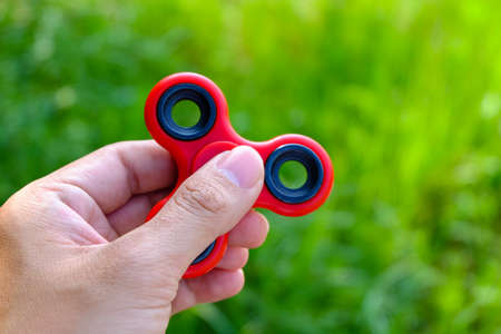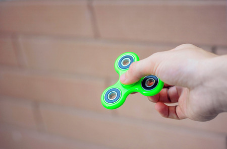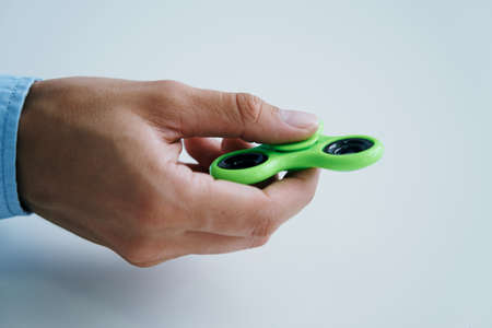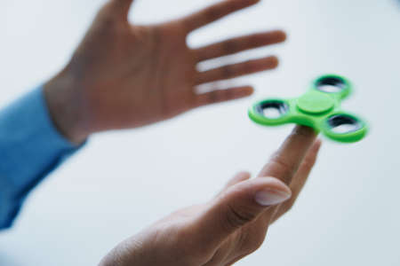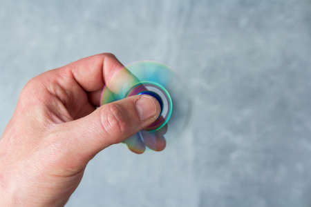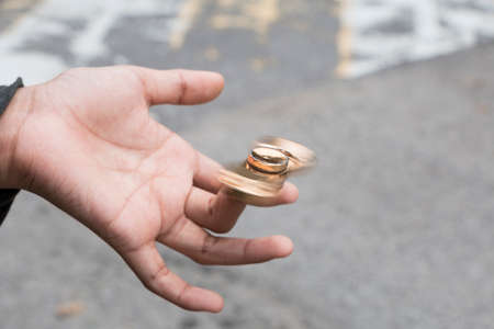 Young man spinning the spinner device in his fingers. Blurred fast motion. Popular toy device in 2017. Soft focus.