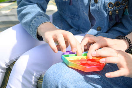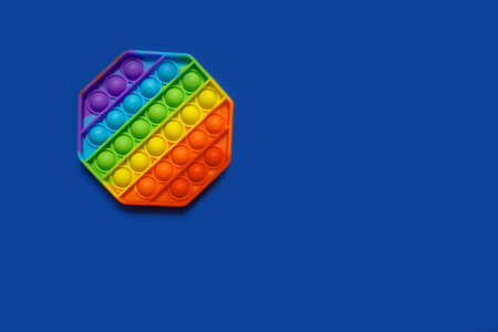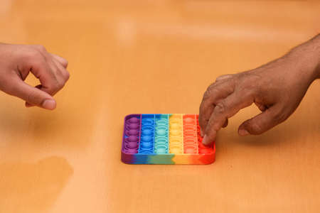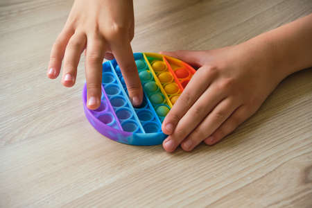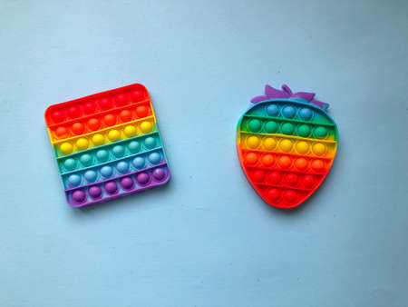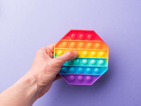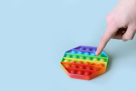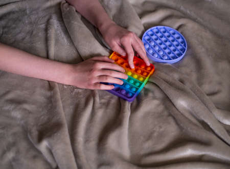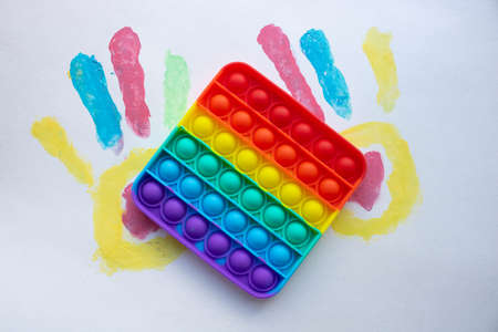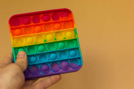 toy antistress pop it on a rainbow background, fidget toy, popping bubbles and calm down, development of the motor skills of hands and fingers