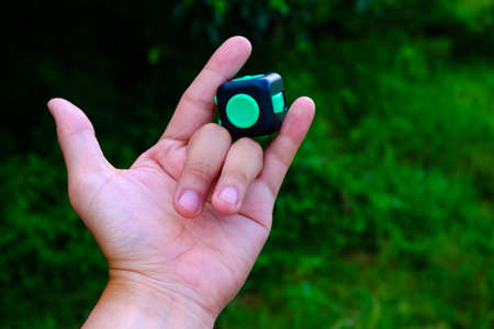 Fidget cube antis stress toy. Detail of finger play toy used for relax. Gadget placed on colorful bokeh background.