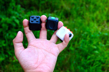 Fidget Cube stress reliever, fingers toy in bokeh background, white. (relax)
