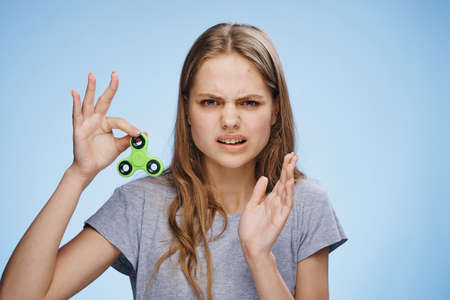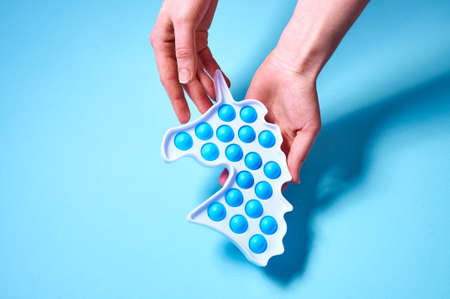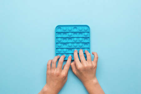Hands of a child with an anti-stress toy on a blue background. A popular anti-stress product.