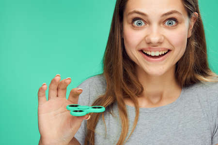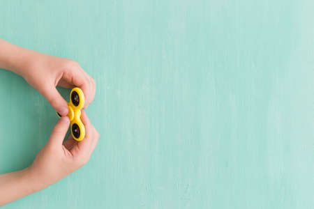 Child's hand spinning a fidget spinner device on turquoise background. Top view. Playing with a yellow hand spinner fidget toy