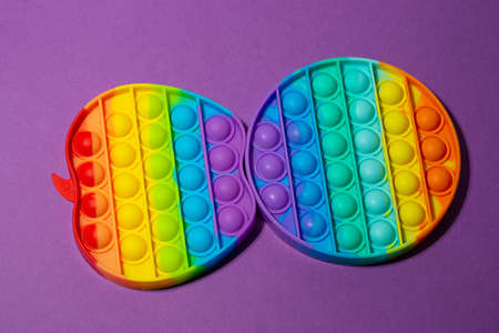 Top view of the sensory toy pop it. New trendy rainbow toy. Colorful anti stress silicone sensors toy for children and adult on purple background