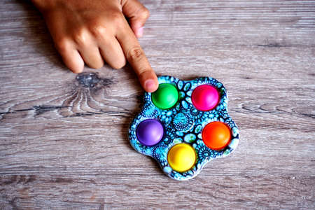 Pop it fidget toys to reduce stress and anxiety in kids and adults, hand pushing a bubble
