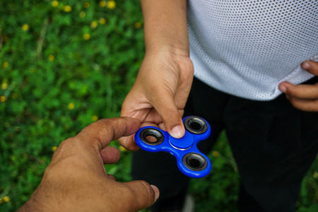Hands of unknown boy playing with fidget spinner, close up. Tren