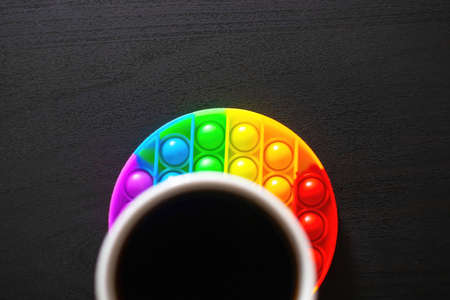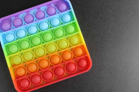New popular silicone colorful antistress pop it toy for child on black background. View from above. Copy space. Simple dimple