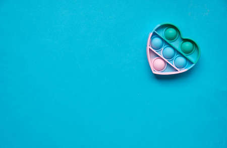 Heart, silicone colorful anti-stress toy on a blue background. Click the pop up bubble. simple toy with dimples. The concept of romance, love, gift, valentine's day, holiday