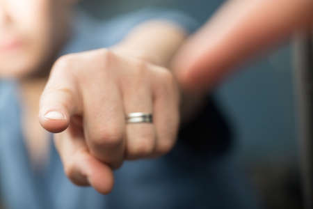 Man and woman's fingers pointing at each other