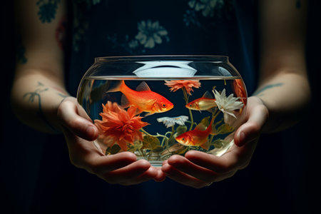 Hand holding multi colored fish in tropical fish tank underwater generated by artificial intelligence