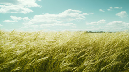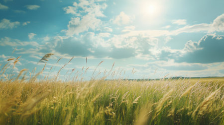 This serene outdoor landscape showcases golden grasses swaying gently under a clear blue sky adorned with fluffy clouds, creating a tranquil summer scene.