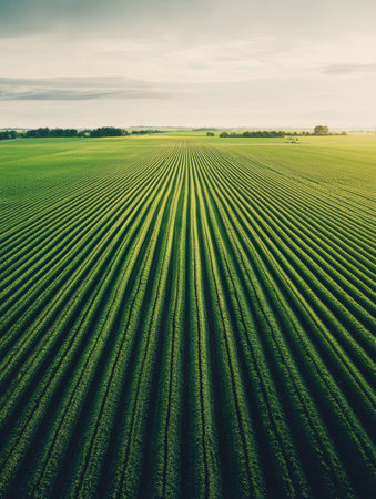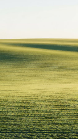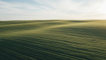 Expansive green rolling farmland exhibits subtle linear patterns under a soft, lightly clouded sky, conveying a sense of growth.