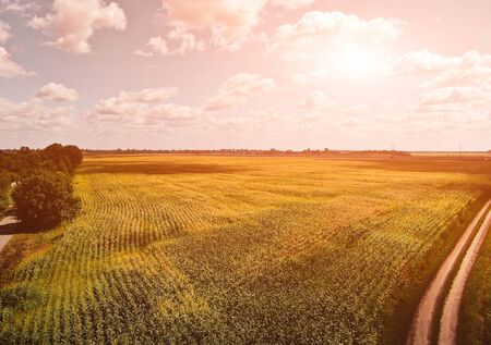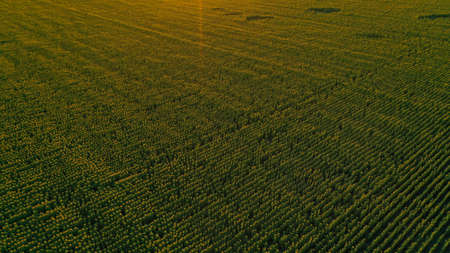 Bright yellow sunflower field in sunlight. Location place of Ukraine, Europe. Photo of ecology concept. Perfect natural wallpaper. Textural image of drone photography. Discover the beauty of earth.
