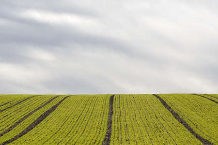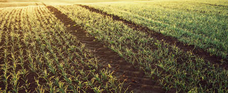 Green plowed agricultural field, tractor tracks, close-up. Picturesque panoramic landscape. Rural scene. Natural pattern, texture, background