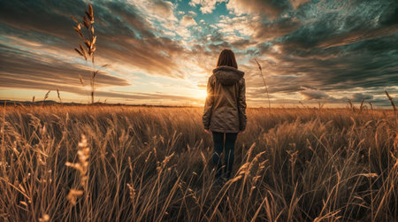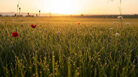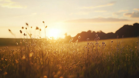 Golden hour sunlight bathes a vast field of tall green grass and scattered wildflowers, creating a hazy, serene...
