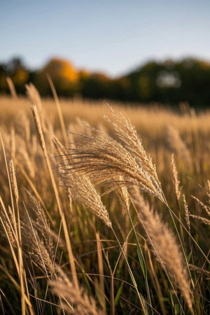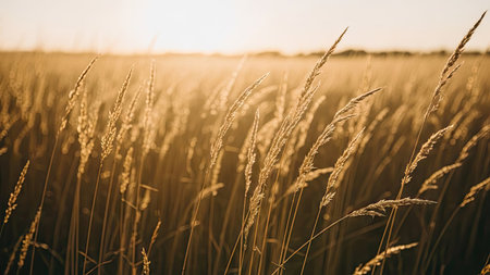 Golden sunlight illuminates tall grass swaying gently in a peaceful meadow during late afternoon creating a calm and warm atmosphere.