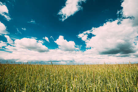 Countryside Rural Field Landscape With Young Wheat Sprouts In Spring Sunny Day. Agricultural Field. Young Wheat Shoots