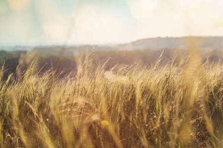 Close up of golden summer meadow grass during sunny morning.Bright summer or spring background for design.