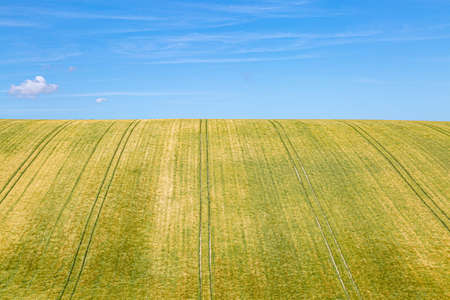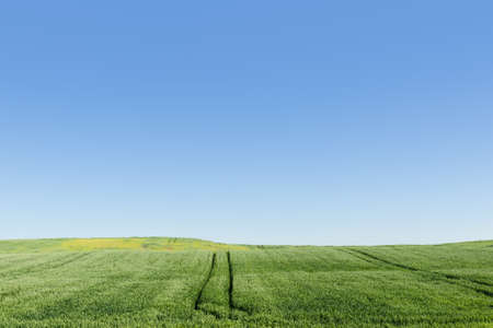 Green cultivated field and clear blue sky. Summer calm landscape.