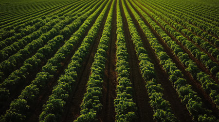 Perfectly aligned green crop rows stretch into the distance, demonstrating clean symmetry and a natural color palette bathed in soft, warm light.