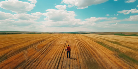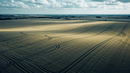 Cloudy showing aerial view of a vast golden wheat field under a dramatic cloudy sky with tire tracks from agricultural machinery creating patterns across the...