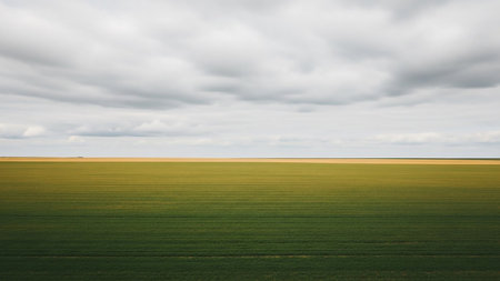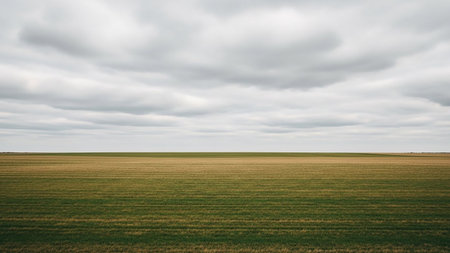 Backgrounds/ showing vast agricultural field with muted green and golden brown tones under a cloudy sky stretching to the horizon keywords: field, agriculture,...