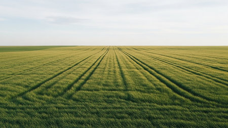 Towards showing vast green agricultural field with tractor tracks leading towards the horizon under a pale sky keywords: field, agriculture, green, grass, crop,...