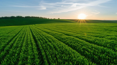 AI Generated. Beautiful landscape vast green field rows crops sky Agricultural