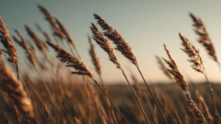 This image features tall grasses swaying gently in the breeze, bathed in soft sunlight during sunset, creating a tranquil atmosphere perfect for nature lovers.