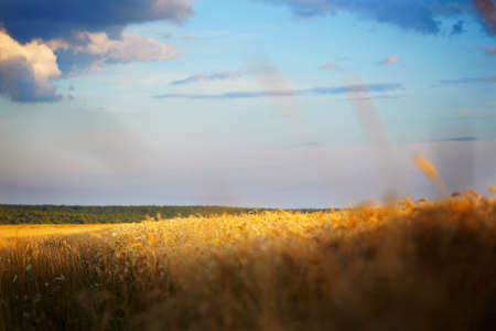 Golden ears of wheat in the field at sunset. Shallow depth of field
