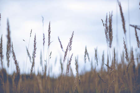 Ears of dry grass in a rural meadow in the rays of the setting sun. Agriculture concept. The field is resting and preparing for the sowing of wheat next year. Toning