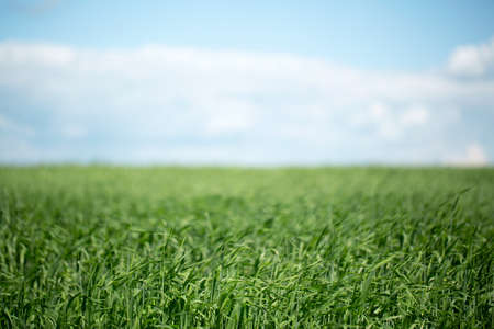 Field of green grass in summer on the horizon with a blue cloudy sky.